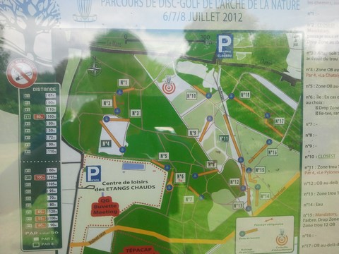 A côté de chaque départ, il informe les joueursde la configuration du trou. On y trouve, le numéro du trou, le par, la distance entre le tee de départ et la cible, les éventuelles zones hors limites (OB), les passages obligatoires (mandatories) et drop zone et éventuellement le dénivelé.